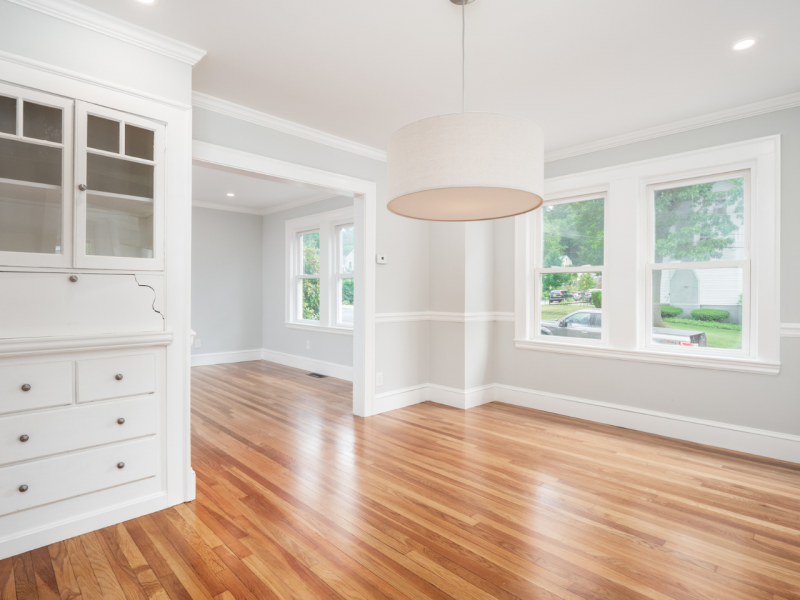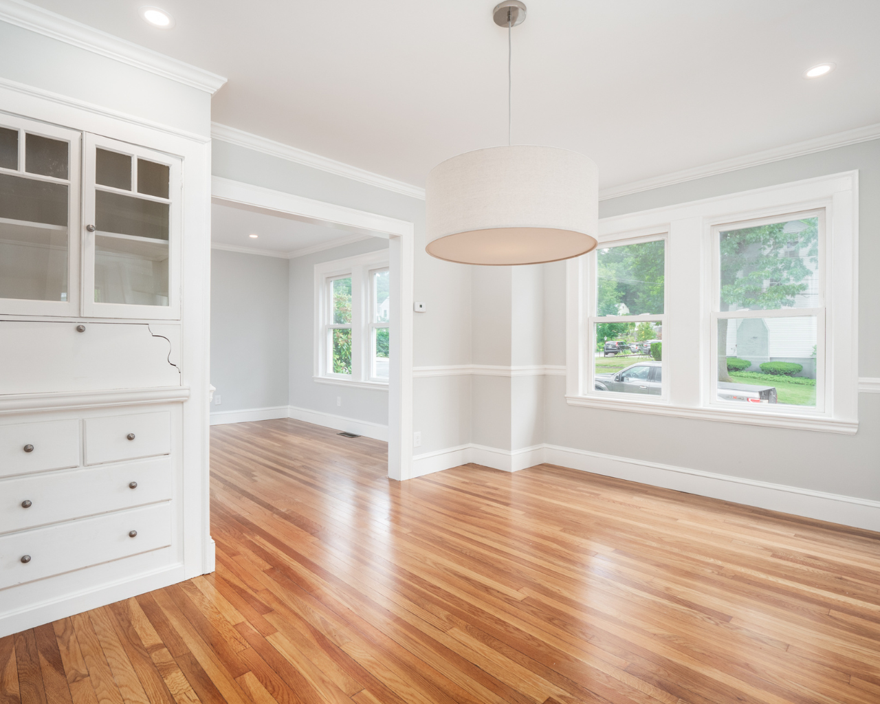 In the dining room, the vintage dish display gives the space a classic charm that is perfect for creating new memories. We also retained the original wood fireplace, which, along with the new mantel design, adds a contemporary touch.